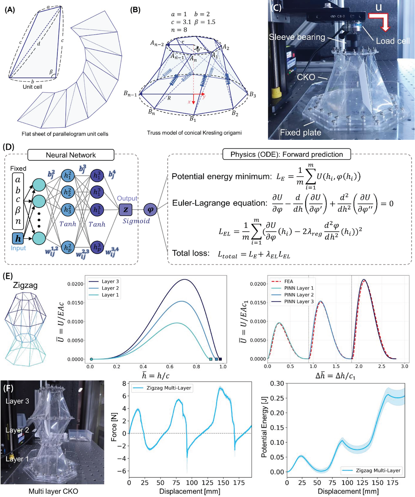 This is what Kang et al. set out to explore using a physics-informed neural net (PINN). In making use of a PINN this work presented two approaches to designing the elegant cylindrical folding pattern that made up a conical Kresling origami (CKO) shape. These were a forward prediction approach and inverse design approach, both of which used a fully connected feedforward neural net (NN) model. As shown in the inset D in the figure below these consisted of 2 hidden layers and 128 tanh-activated neurons.