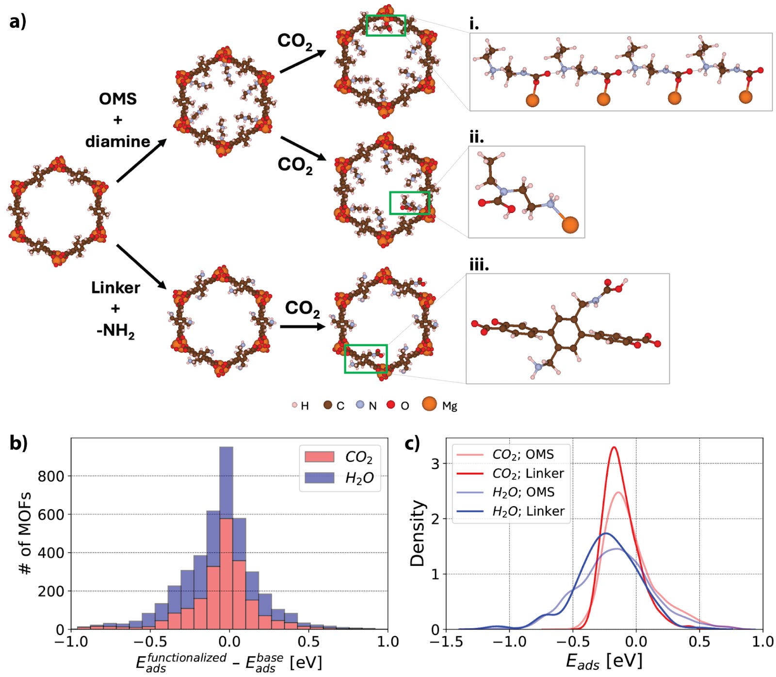Figure 1: a) Representation of two different functionalizations of linker amination (bottom), and OMS diamine functionalization (top) introduced into the dataset of metal organic frameworks. IRMOF-74-III was used as a sample MOF. i. Demonstration of ion-paired cooperative formation for a carbamate chain provided CO2 is adsorbed onto metal amine lattices. ii. Carbamic acid, a sample variation of the reaction in ‘i.’ where instead of a 2:1 stoichiometry only a 1:1 stoichiometry exists. iii. Reacted product ‘ii’ for carbamic acid on MOF. b) Difference in most favourable adsorption energies between functionalized and non-functionalized MOFs for CO2 and H2O. c) Energy difference in amine-functionalized, and OMS functionalized, MOFs.